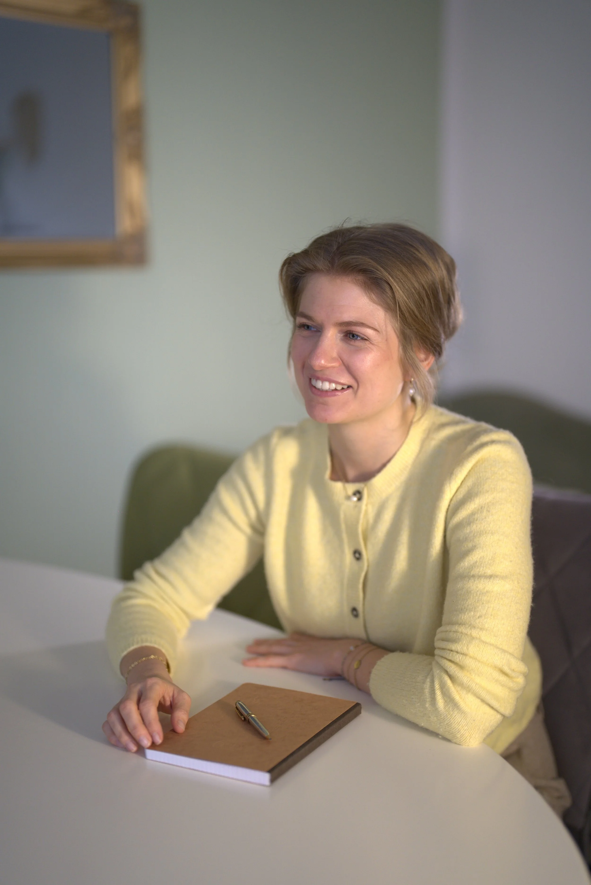 Eine Person hält einen Stift und ein Notizbuch in der Hand, während sie mit einer Frau spricht, die im Hintergrund sitzt, auf einem Sofa, im Raum.